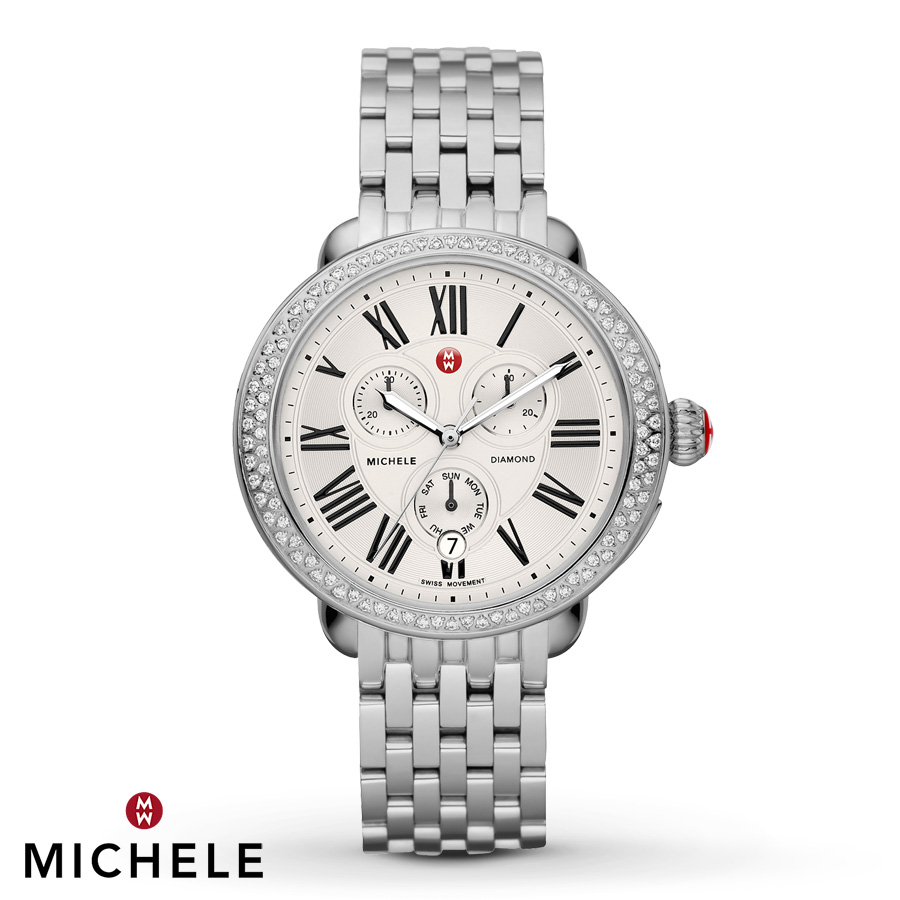 Facilitated with the silver dial chronograph and embellished with the makings of stainless steel, this is one of the Michele Serein branded products. Stainless steel has been acquired by its case and bracelet also. Bezel setted with the options of diamonds along with the Roman numbering appearance for the hour-markers, along with luminescent markers and hands. 6’o clock location selected for displaying date, managing timeline through 3 sub dials thirty minute(s), 60 second(s) and week days.